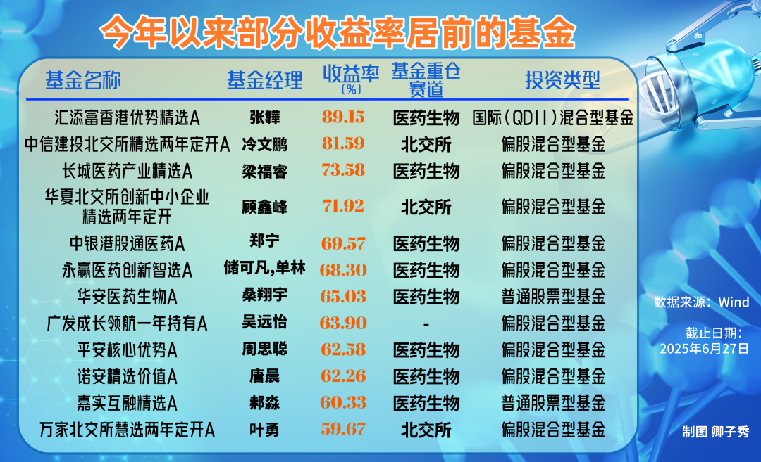 创新药相关基金与北交所相关基金占据了今年上半年基金投资业绩排行榜前列的大多数名额,成为两个最大的赢家。